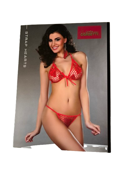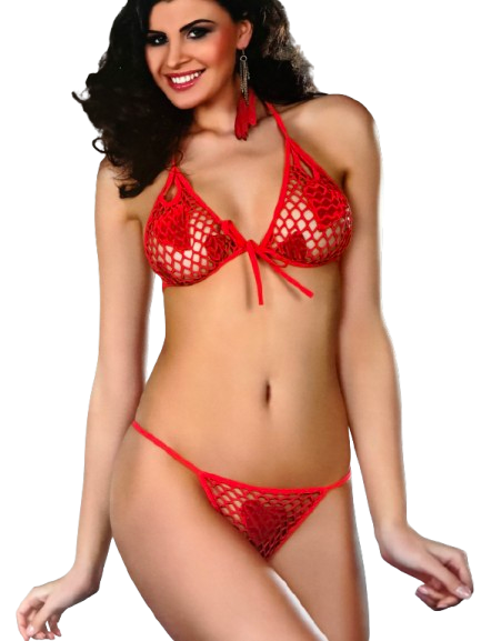 Rødt BH sæt fra Corsetti i net. BH og G-streng påsyet hjerter.