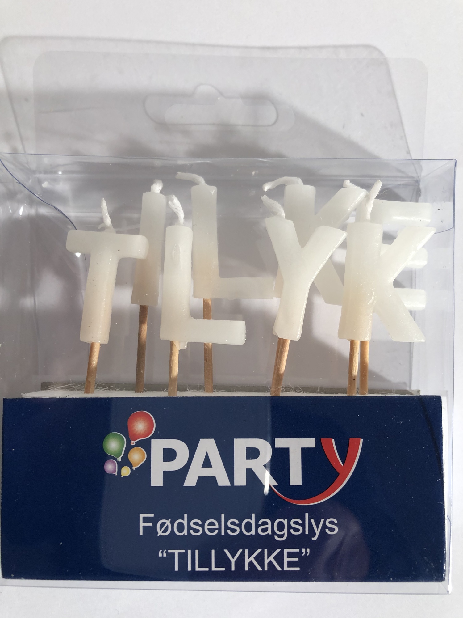 Fødselsdagslys TILLYKKE på pinde, hvid