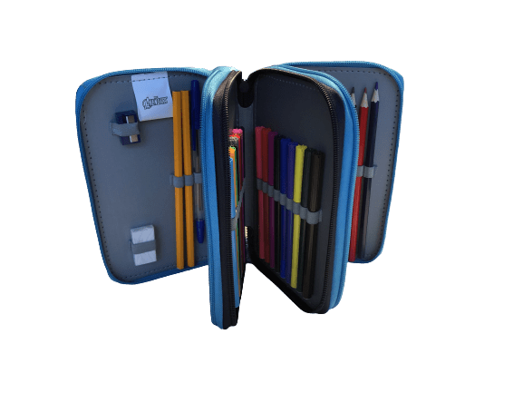 Indeholder 43 dele: 18 farveblyanter, 18 tuscher, 2 blyanter, 1 kuglepen, 1 viskelæder, 1 blyantspidser, 1 lineal, 1 skriveblok