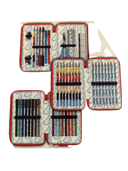 Indeholder 42 dele: 18 farveblyanter, 18 tuscher, 2 kuglepenne, 1 viskelæder, 1 blyantspidser, 1 saks, 1 lineal