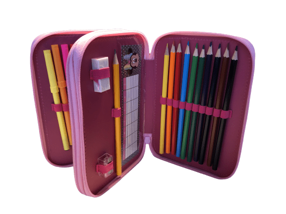 Indeholder: 27 dele: 10 farveblyanter, 10 tuscher, 2 blyanter, 1 viskelæder, 1 blyantspidser,1 lineal, 1 skriveblok, 1 skoleskema.