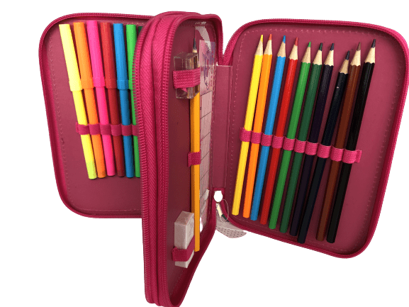 Indhold 27 dele: 10 farveblyanter, 10 tuscher, 2 blyanter, 1 lineal, 1 blyantspidser, 1 viskelæder, 1 skriveblok, 1 skoleskema