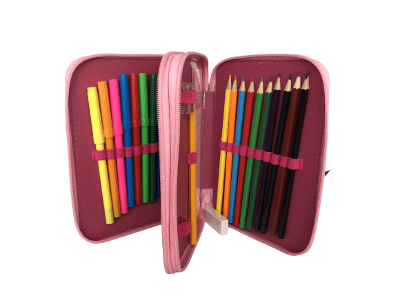Indhold 27 dele: 10 farveblyanter, 10 tuscher, 2 blyanter, 1 lineal, 1 blyantspidser, 1 viskelæder, 1 skriveblok, 1 skoleskema.