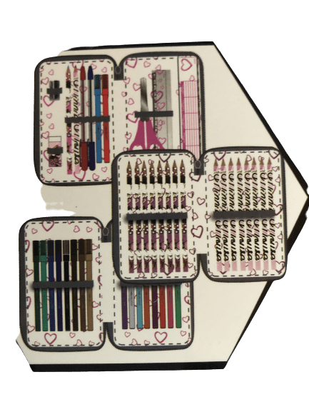 Indeholder 42 dele: 18 farveblyanter, 18 tuscher, 2 kuglepenne, 1 viskelæder, 1 blyantspidser, 1 saks, 1 lineal