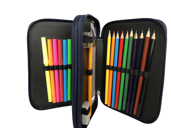 Indhold 26 dele: 10 farveblyanter, 9 tuscher, 2 blyanter, 1 lineal, 1 viskelæder, 1 blyantspidser, 1 skriveblok, 1 skoleskema.