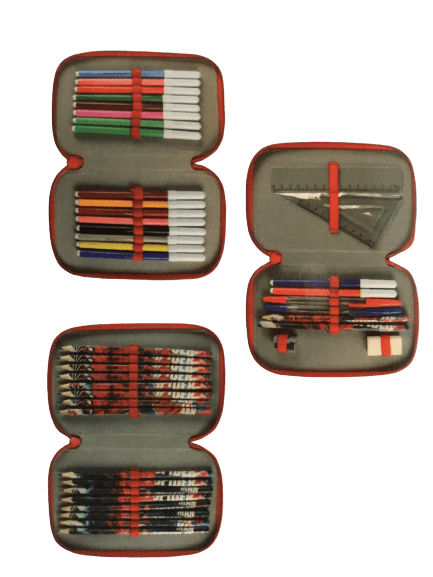 Indeholder 42 dele: 18 farveblyanter, 18 tuscher, 2 kuglepenne, 1 viskelæder, 1 blyantspidser, 2 linealer