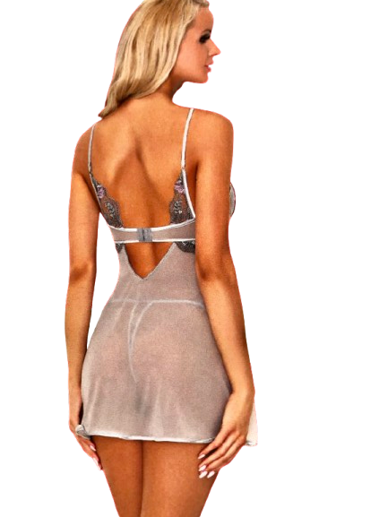 Elegant natkjole med G-streng trusse. Flot broderi på kjolen og trussen, i gaveæske