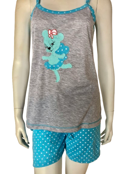 Lækker pyjamas. lys gå med kanter i tyrkis, påsyet sød bamse. Tyrkis shorts med hvide prikker